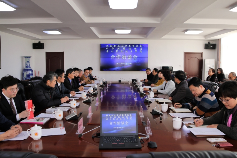 2017年12月26日,韩国职业大学教育协会(以下简称韩国教育协会)秘书长黄莆银先生、中华网韩流频道总编李龙植先生一行九人来我院友好访问,进一步推进落实合作事宜。我院副院长马莉及相关职能部门负责人、各系主任与韩方进行友好洽谈。