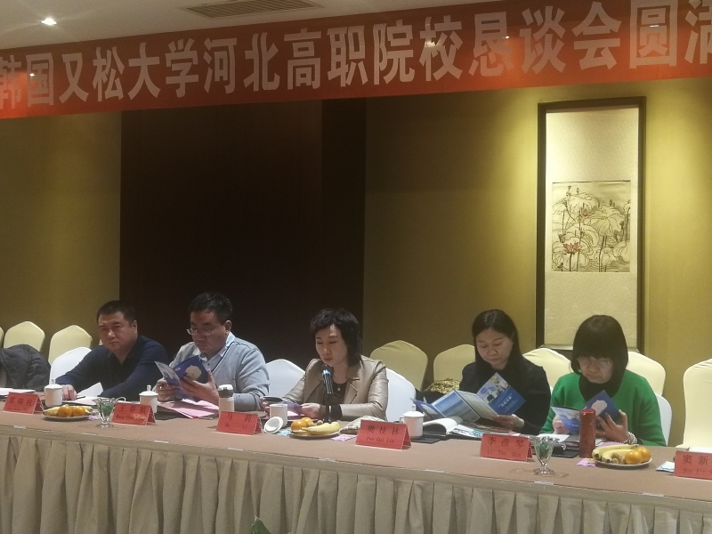 恳谈会现场,河北省教育厅国际教育交流中心副主任孙冬介绍我省近几年高职院校国际化发展情况;韩国又松大学副校长甘瑞瑗、国际教育学院院长李达荣分别对该校国际化办学、留学生服务管理进行了详细介绍;河北女子职业技术学院党委书记窦新顺介绍了该校国际化办学经验;我院副院长马莉与韩国又松大学副校长甘瑞瑗在恳谈会现场共同签署了友好院校协议。