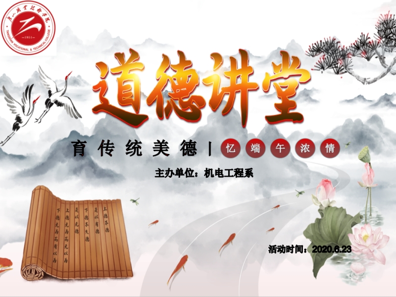 伴随着优美的音乐,2020年机电工程系“育传统美德,忆端午浓情”道德讲堂圆满结束。洗涤心灵,感悟道德,践行道德,这是我们开设道德讲堂的根本宗旨。激发善心,抒发善意,真心希望同学们,在今后的生活中,常怀善良之心,做一个讲文明,重修养的人。(机电工程系)