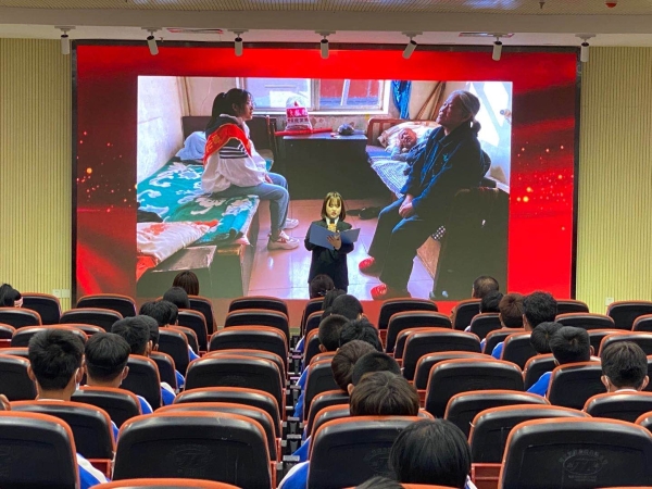 在“学模范”中,通过观看全国道德模范——蓝连青孝亲敬老的视频,进一步增强了同学们对敬老爱老的意识。主人公的感人事迹,集聚正向能量,展示道德力量,营造了“积小德为大德,积小善为大善”的良好风气;刘蕊同学在“讲故事”中,深情讲述了习近平总书记在各地留下了模范敬老、践行孝道的瞬间;刘天月、张立薇同学在“谈感悟”中,两位同学用切身体会和感悟,表达对“孝亲敬老”的认知。恪守孝道,付出孝心与爱心,让我们在感恩的心中重新发现向善的力量;任仪、靳雨霖等同学在“诵经典”的环节中,用他们铿锵有力的声音,真挚的感情表达着继承“尊老敬老”的这一中华传统美德的决心与信心;王梓烁、崔瑞芳等学生带来的合唱《当你老了》,动人的歌声环绕在会场,生命受之父母,多年养育之恩难以报答。在最后“行善举”过程中,同学们在大屏幕上积极发言分享感悟,纷纷表示继承和发扬孝亲敬老必须从自己做起,用实际行动传承美德。