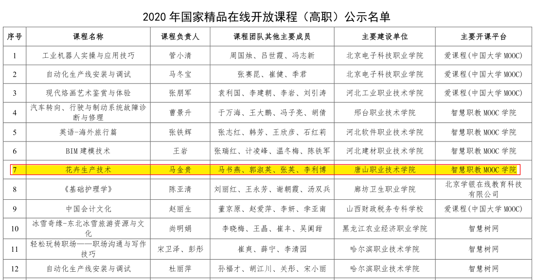 2020年11月3日,教育部职业教育与成人教育司公示认定的2020年国家精品在线开放课程名单,农林工程系马金贵主任负责的《花卉生产技术》课程,经省级教育行政部门申报推荐和专家遴选等程序,成功入选。