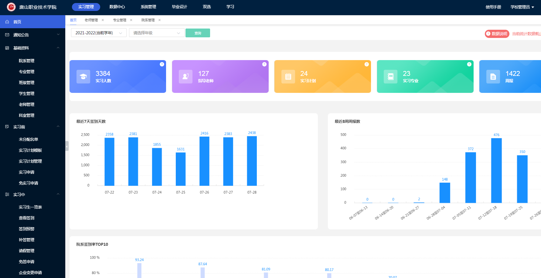 学院7个系共录入实习计划25份。学生自7月初开始实习至今,共提交实习周报1428份。平台数据可以实时、精准的反映学生的实习情况,进而实现实习全过程的精细化动态管理。