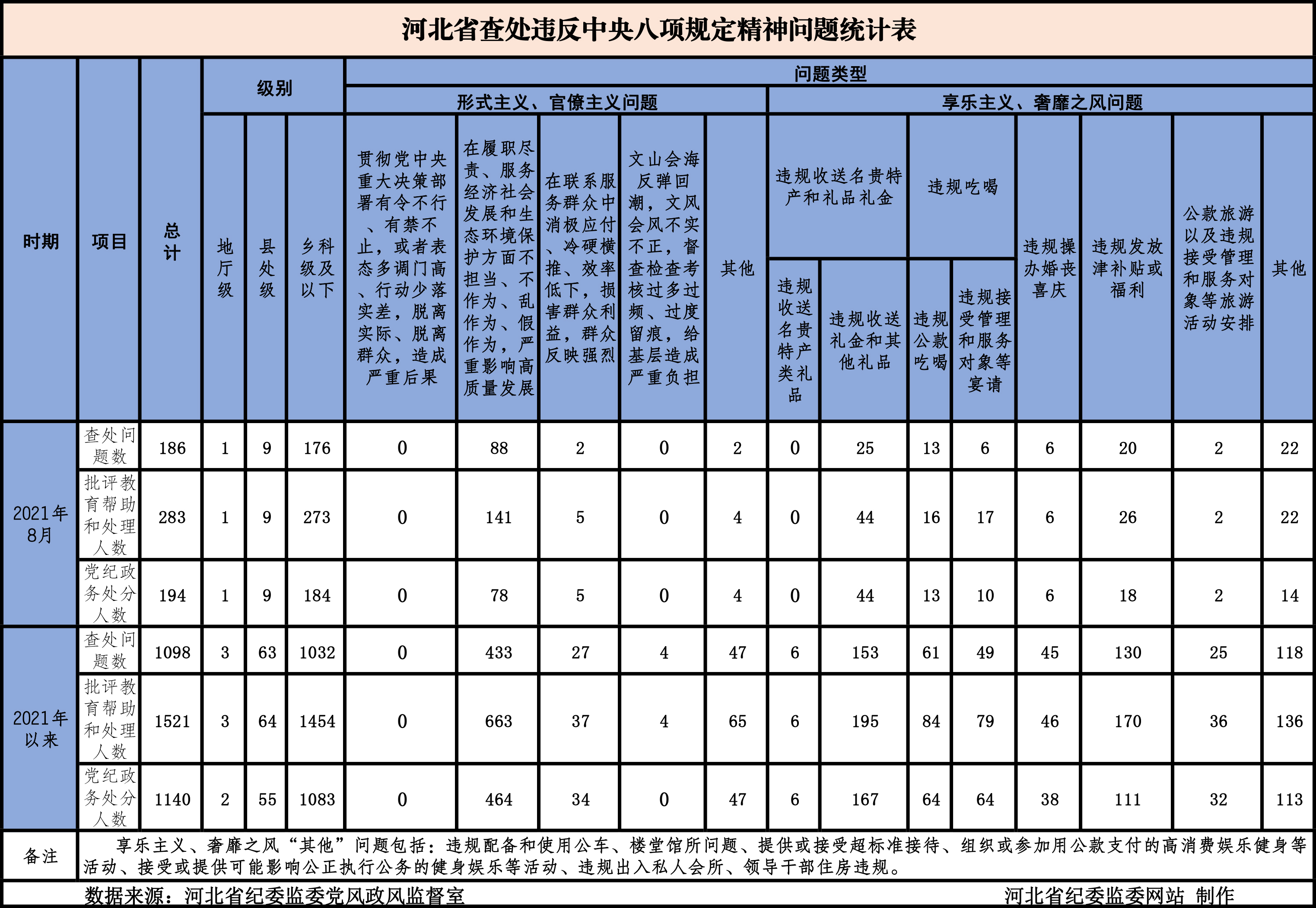 2021年8月,全省各级纪检监察机关共查处违反中央八项规定精神问题186起,批评教育帮助和处理283人,其中党纪政务处分194人。