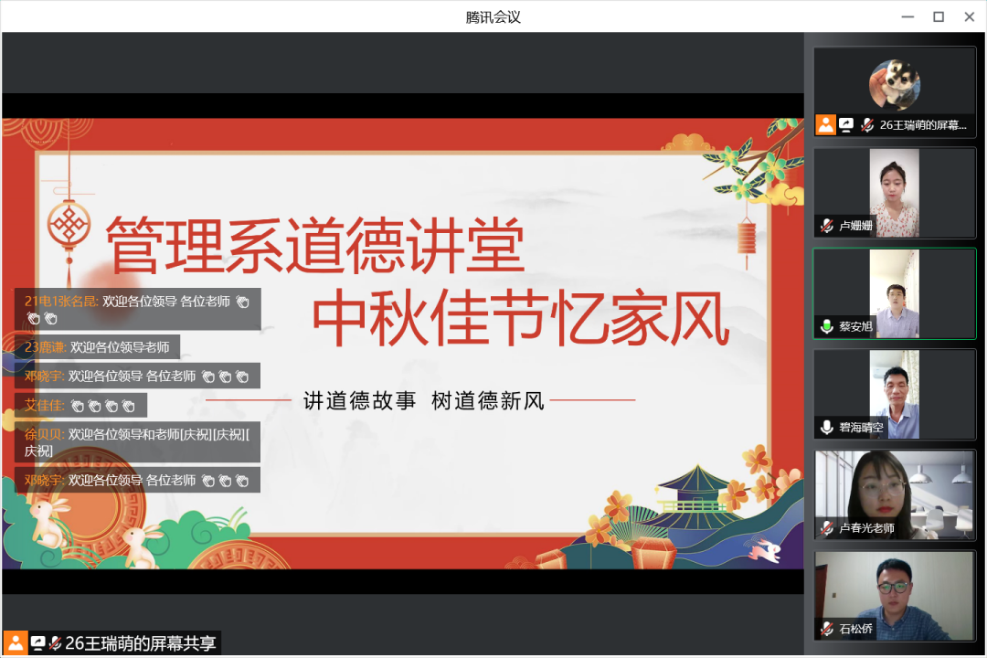 9月8日,由亿百体育党委宣传部主办,管理系承办的“中秋佳节忆家风”主题道德讲堂活动在线上开讲。学院党委委员、宣传部部长王宏,管理系党总支书记王俊河,管理系党总支副书记,管理系团总支书记,以及辅导员、学生代表共150余人参加此次活动。