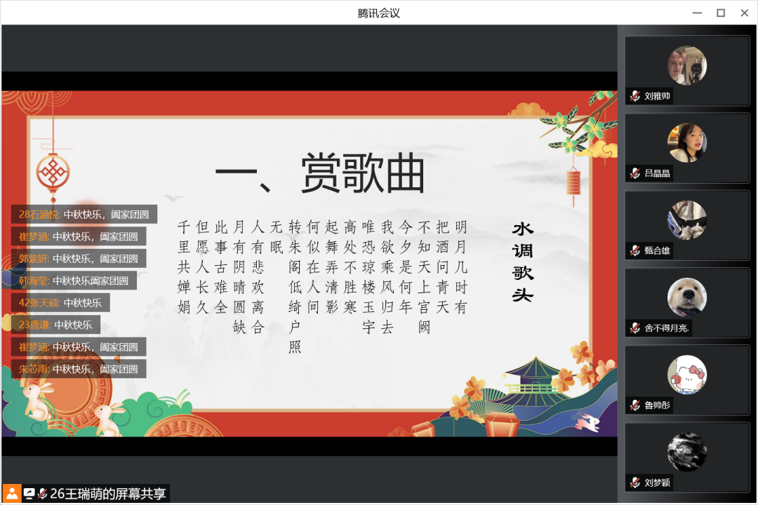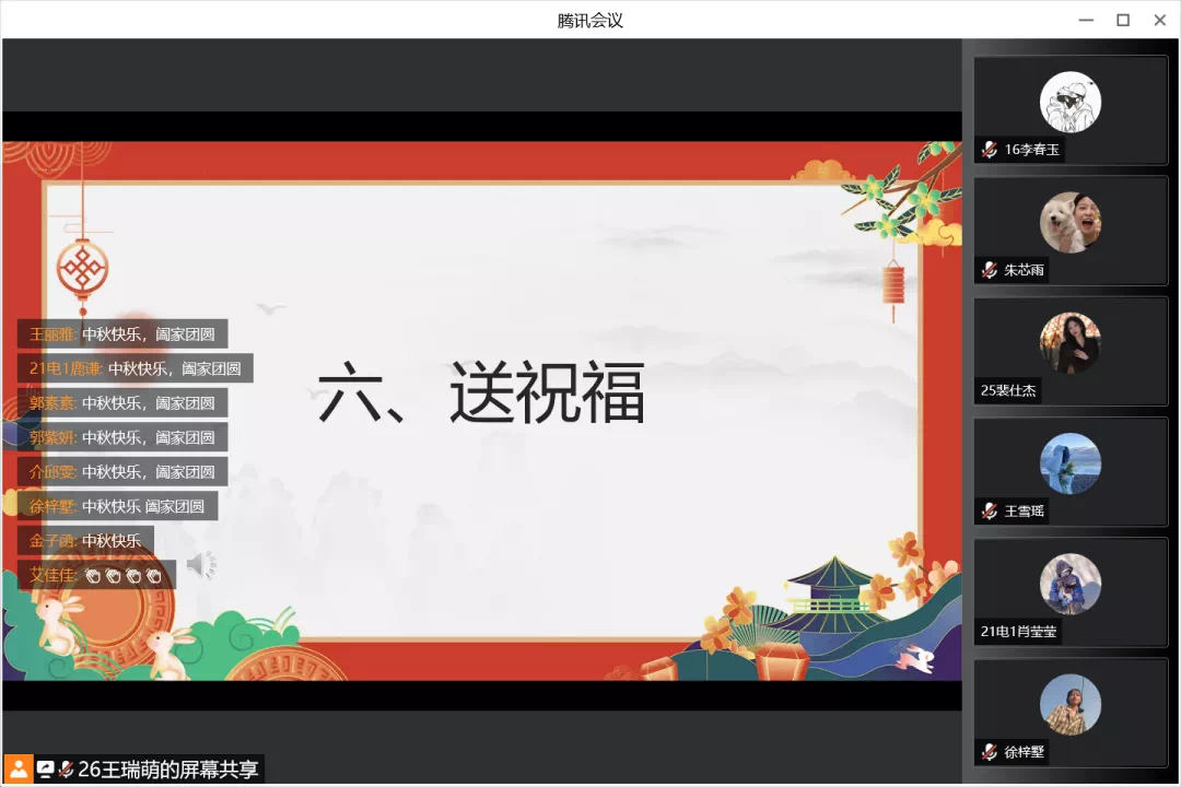 “海上升明月,天涯共此时。”在这团圆的日子里同学们在公屏上送出了自己对同学们、家人们、老师们的中秋祝福!