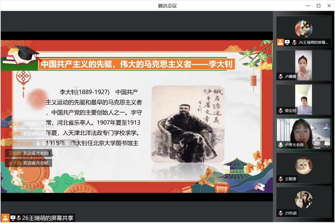 在颂家风环节中,辅导员卢春光老师为我们讲述李大钊家风的故事,一起感悟“家风的力量”。
