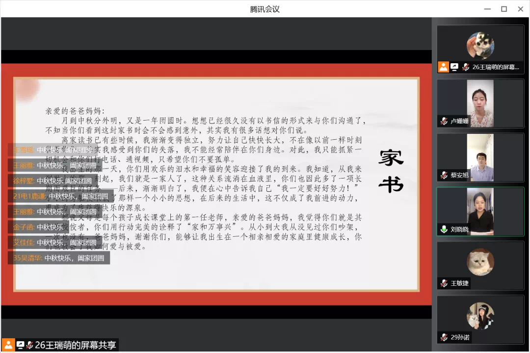 在这团圆的节日里,学生代表刘晓晓为同学们分享了她写给父母的家书,字里行间流露着对父母的思念和感恩。